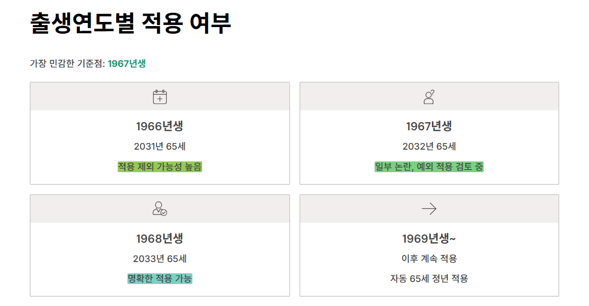 | 1967년생 | 2032년 65세 | 일부 논란, 예외 적용 검토 중 |