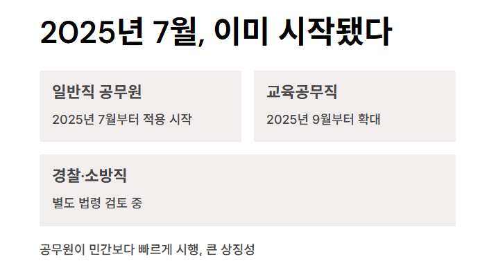교육공무직은 같은 해 9월부터 확대되었으며, 경찰과 소방직은 아직 별도 법령 검토 중이라 구체적 시행 시기는 정해지지 않았습니다.