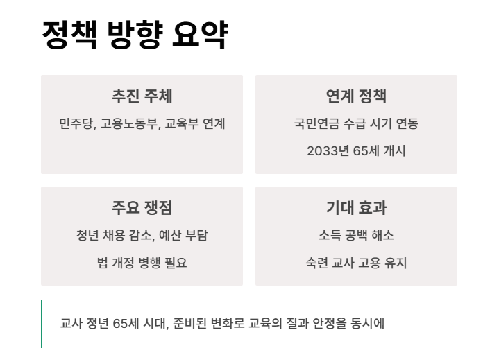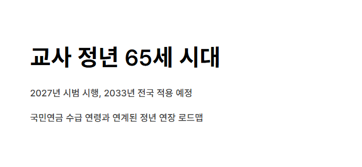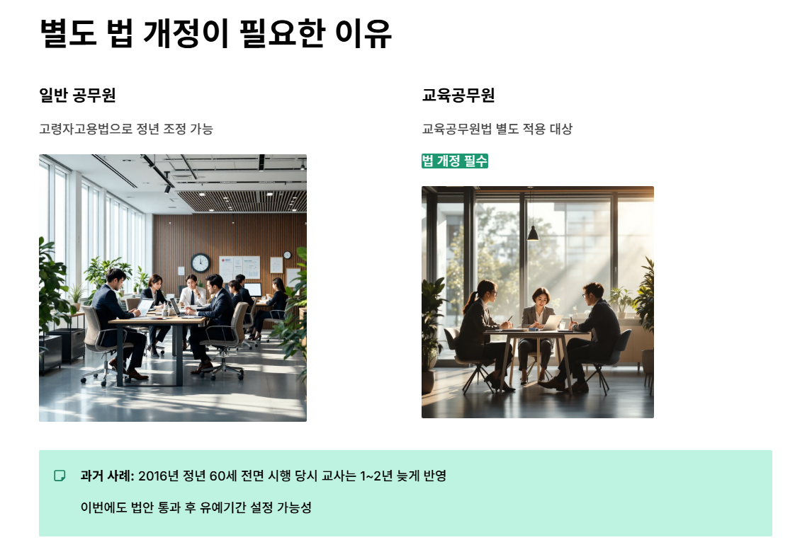 과거에도 정년 60세 전면 시행(2016년) 당시 교사는 1~2년 늦게 반영되었던 전례가 있어, 이번에도 법안 통과 이후 적용까지 유예기간이 설정될 가능성이 큽니다.
