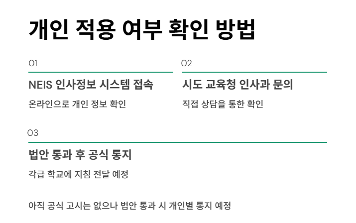 자신이 정년 연장 적용 대상인지 알고 싶다면, 'NEIS 인사정보 시스템'이나 각 시도 교육청 인사과를 통해 확인할 수 있습니다. 아직 공식 고시는 없지만, 법안이 통과되면 각급 학교에 지침이 전달되고, 개인별로도 통지될 예정입니다.