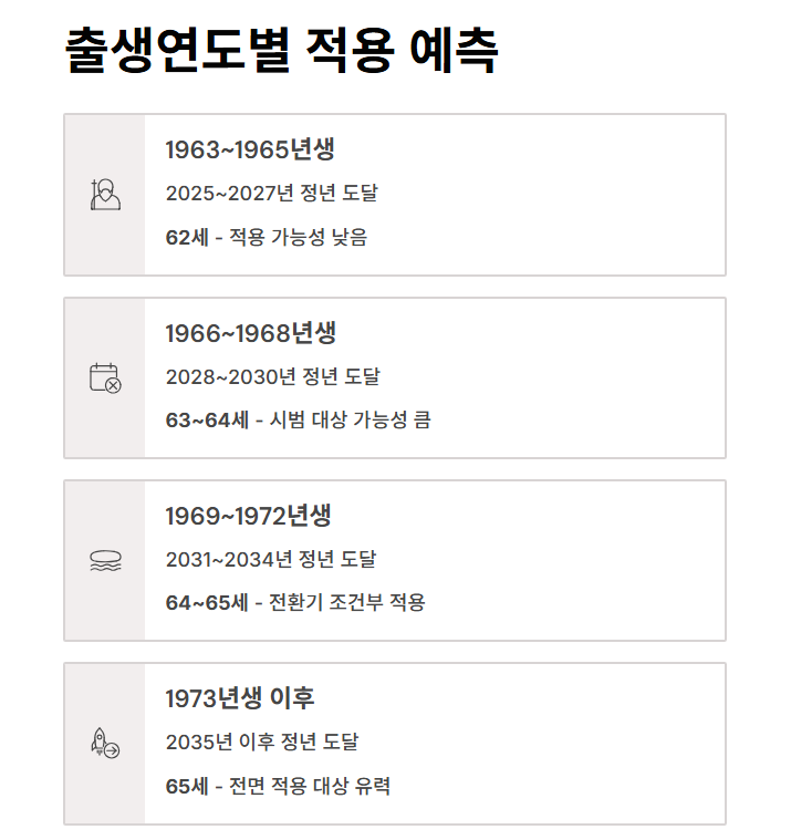 | 1963~1965년생 | 2025~2027년 | 62세 | 적용 낮음, 기존 퇴직 대상 |