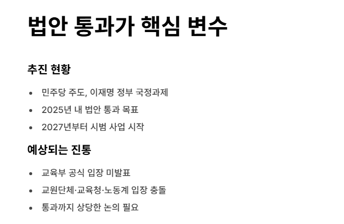 이러한 일정은 법안 통과 이후 '학기 단위'로 조정될 수 있으며, 학교 규모나 지역 여건에 따라 차등 적용될 가능성도 있습니다.