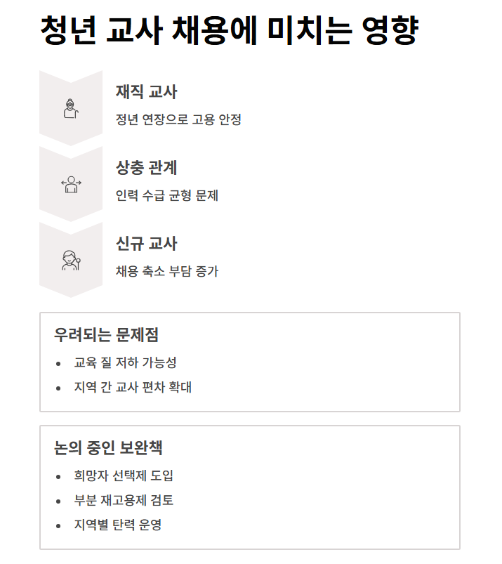 전문가들은 "정년 연장과 신규 채용은 상충할 수밖에 없다"며, 인력 수급의 균형이 무너질 경우 교육 질 저하, 지역 간 교사 편차 확대 등의 문제를 경고하고 있습니다.