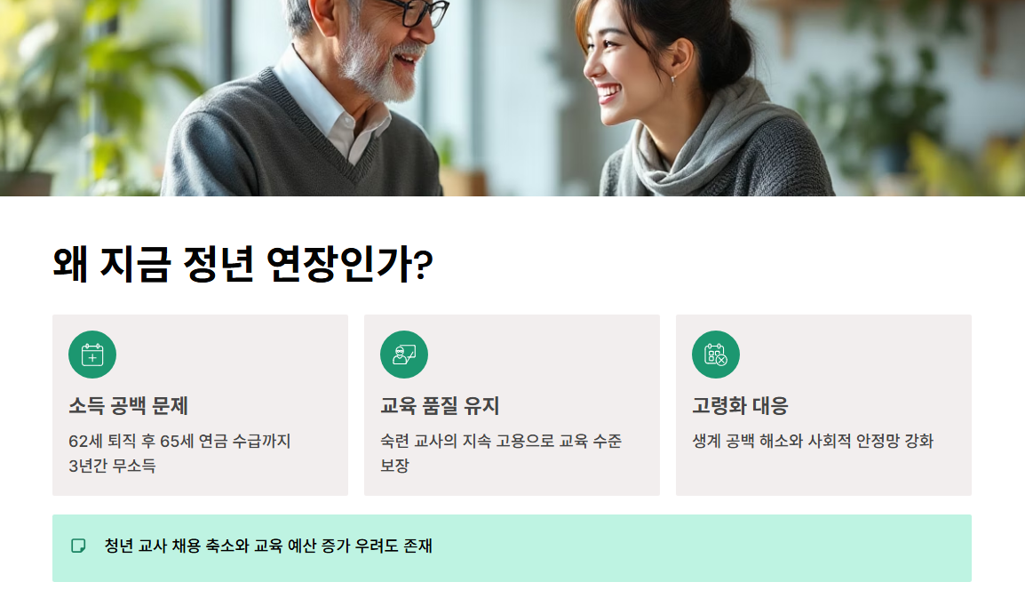 고령화 사회로 접어들며 '정년과 연금 수급 시기 사이의 소득 공백' 문제가 현실화됐습니다. 62세 퇴직 후 국민연금은 65세부터 받는 구조는 사실상 3년간 무소득 상태를 의미하는데요. 이에 따라 정부는 정년 연장을 통해 생계 공백을 줄이고, 숙련 교사의 지속 고용으로 교육 품질을 유지한다는 계획입니다.