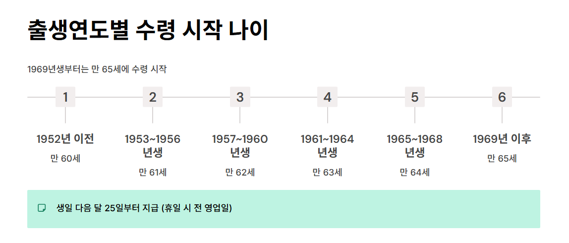 생일이 지난 다음 달 25일부터 연금이 지급되며, 해당 날짜가 휴일이면 전 영업일에 지급됩니다.