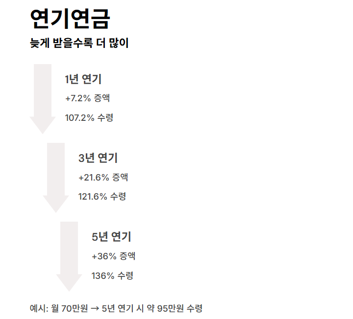 예를 들어, 만 65세에 월 70만 원 받을 수 있는 사람이 70세까지 연기하면 약 95만 원 수령이 가능합니다.