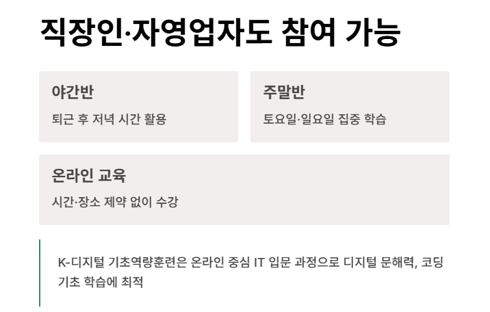 → K-디지털 트레이닝 등 IT 실무 중심 교육 - 일과 병행하며 배우고 싶다면