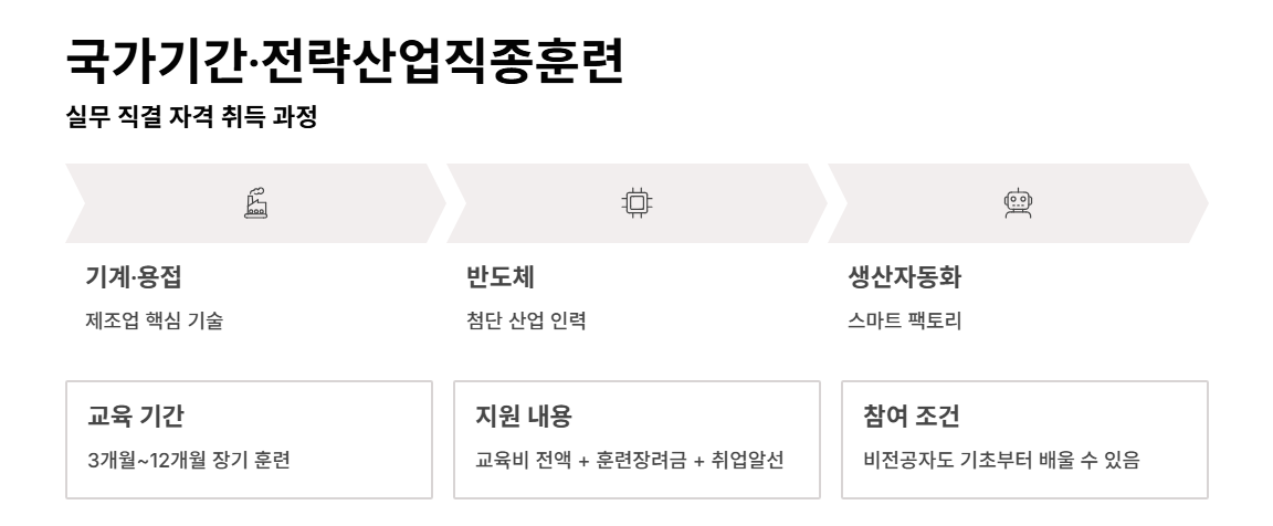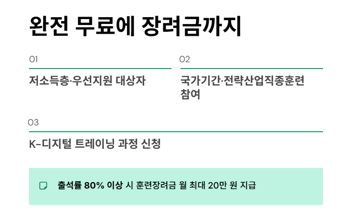 특히 K-디지털 트레이닝, 국가기간전략산업훈련 등은 전액 국비에 장려금까지 제공되어 직업 전환을 준비하는 이들에게 유용한 제도로 자리 잡고 있습니다.