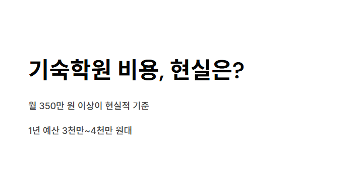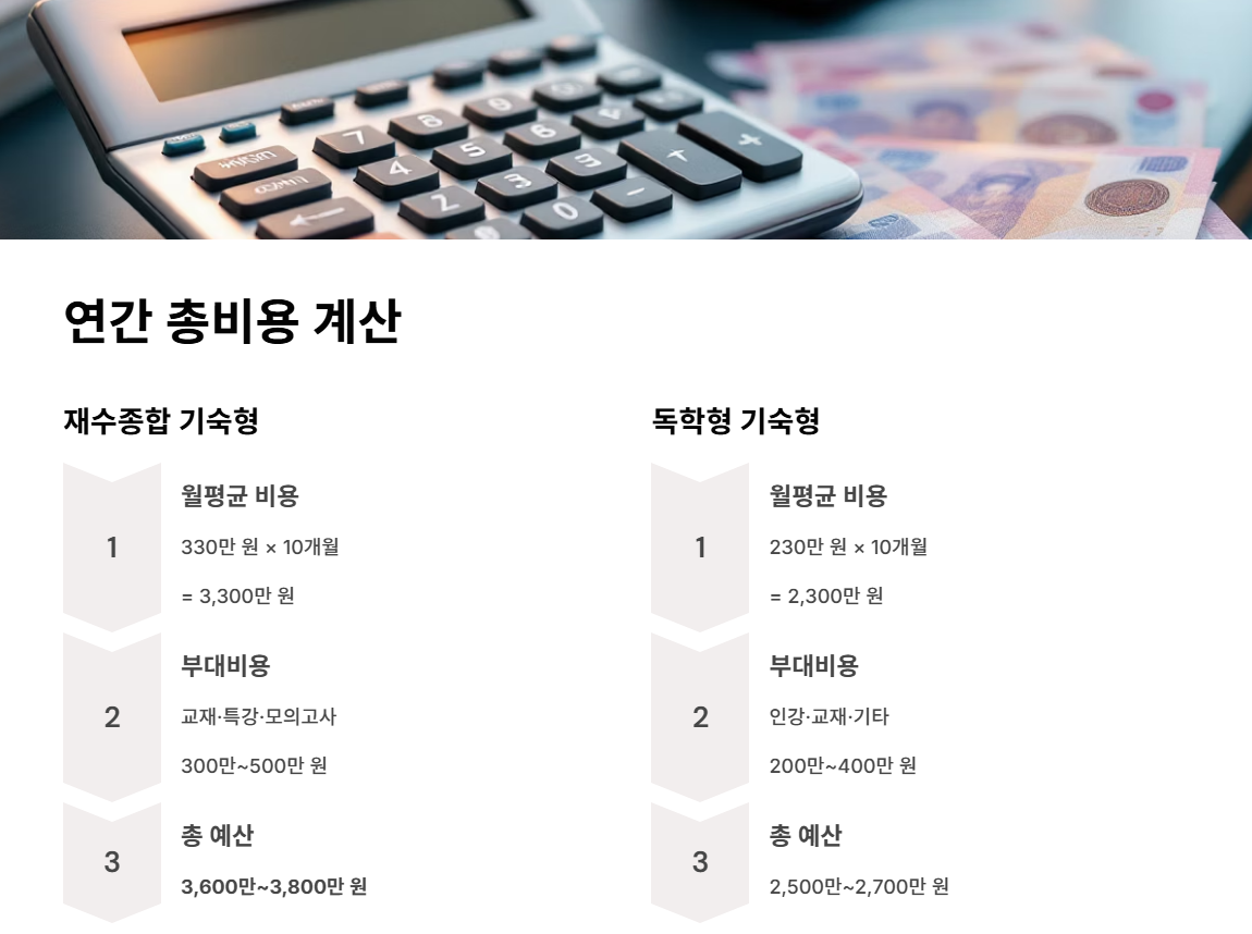 - 종합 기숙학원: 연간 최소 3,500만 원, 여유 있게는 4,000만 원