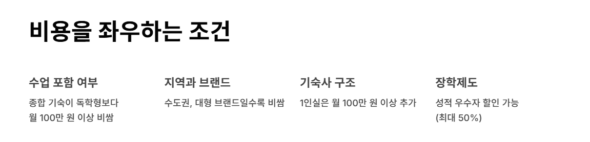 기숙학원 비용은 아래 요인에 따라 큰 차이가 납니다.