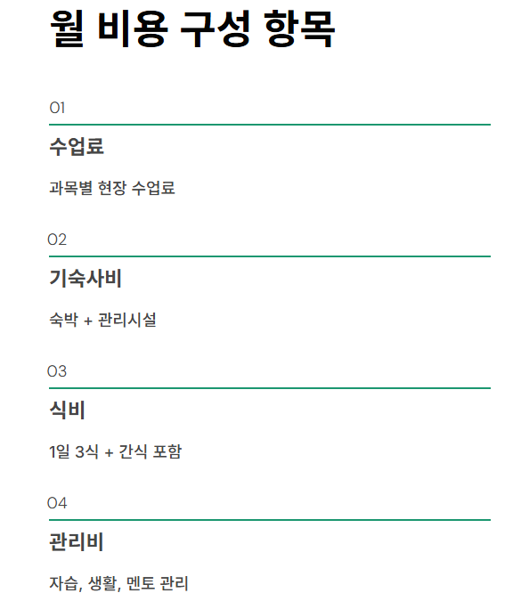 - 기숙사 구조: 1인실은 월 100만 원 이상 추가