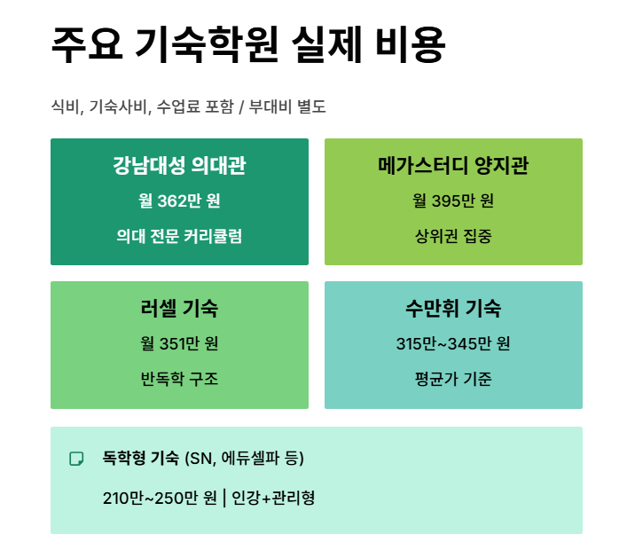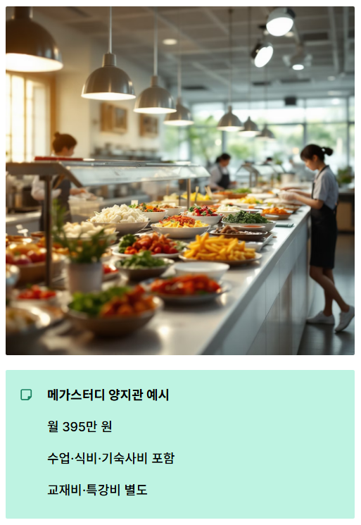 예시로 메가스터디 양지관의 경우 월 395만 원이며, 수업·식비·기숙사비가 모두 포함되어 있습니다. 그러나 교재비, 특강비, 단체복 등은 별도입니다.