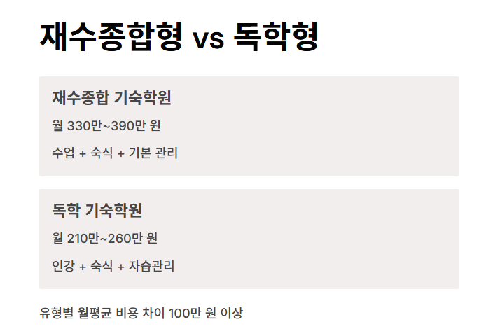 기숙학원은 크게 두 가지 유형으로 나뉘며, 유형에 따라 월평균 비용 차이가 100만 원 이상 나기도 합니다.