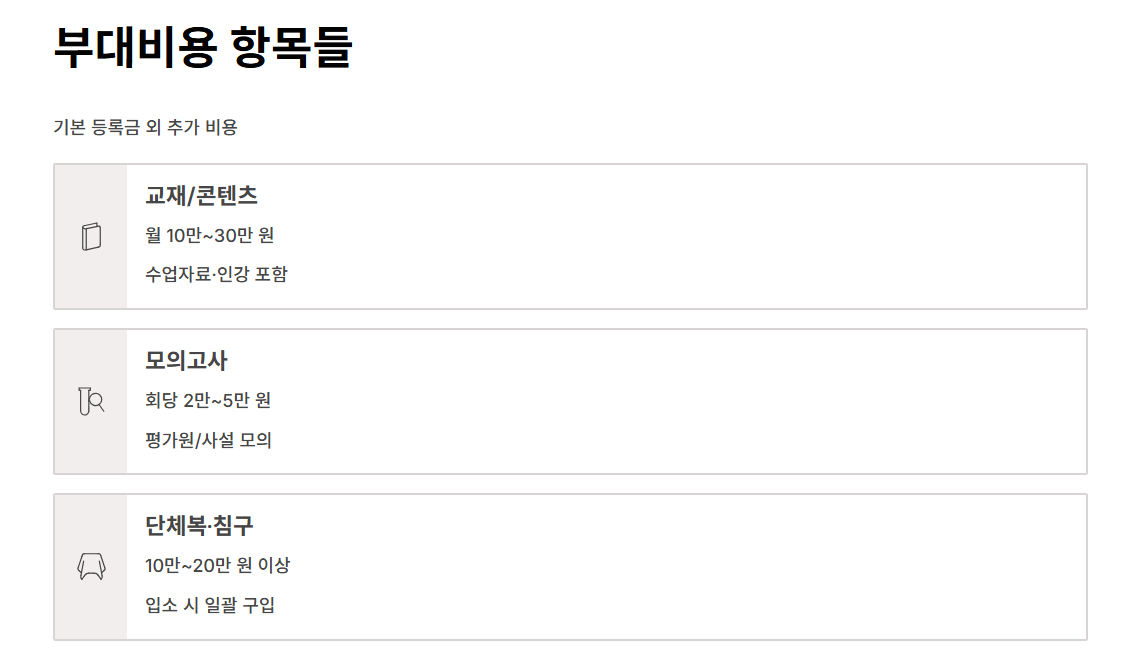| 교재/콘텐츠 | 월 10만~30만 원 | 수업자료·인강 포함 |