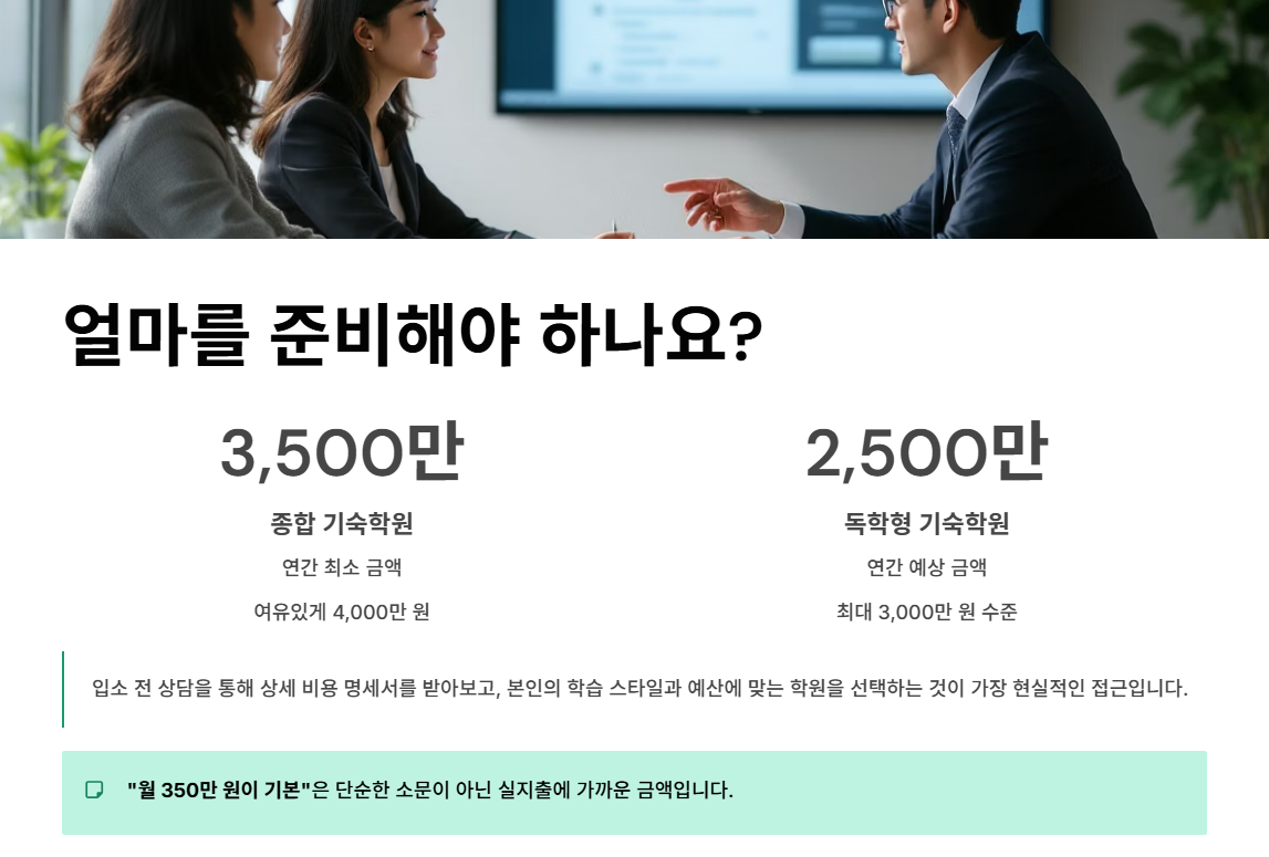 입소 전 상담을 통해 상세 비용 명세서를 받아보고, 본인의 학습 스타일과 예산에 맞는 학원을 선택하는 것이 가장 현실적인 접근입니다. “월 350만 원이 기본”이라는 말은 단순한 소문이 아닌 실지출에 가까운 금액이기도 합니다.