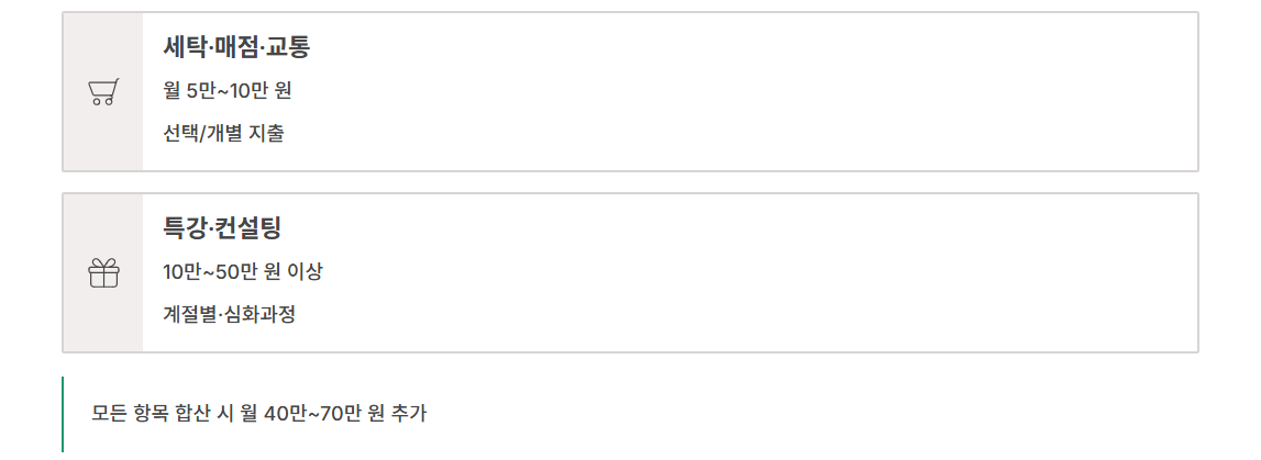 | 세탁·매점·교통 | 월 5만~10만 원 | 선택/개별 지출 |