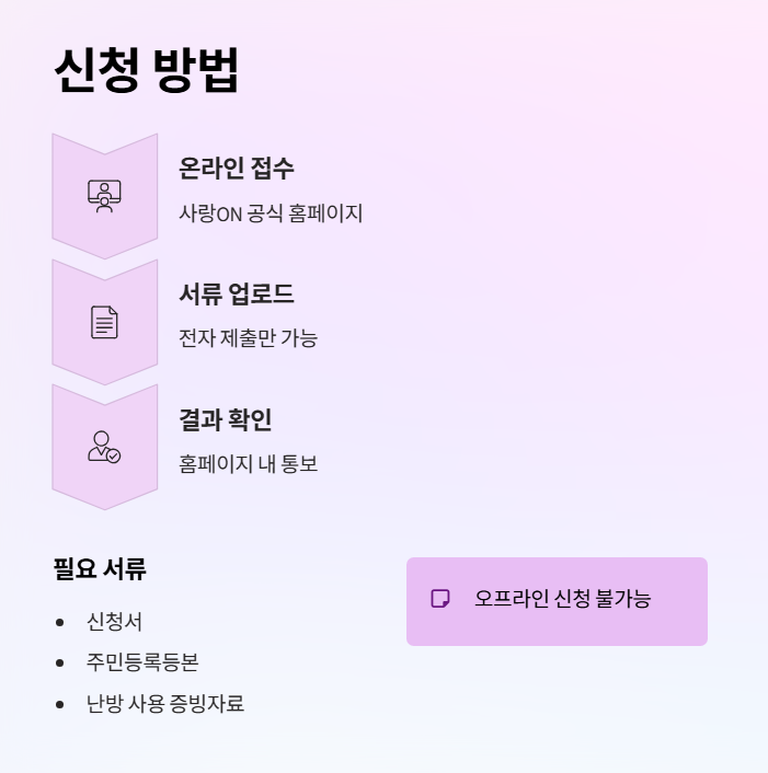 | 사랑ON 공식 홈페이지 접수 | 신청서, 주민등록등본, 난방 사용 증빙자료 등 |