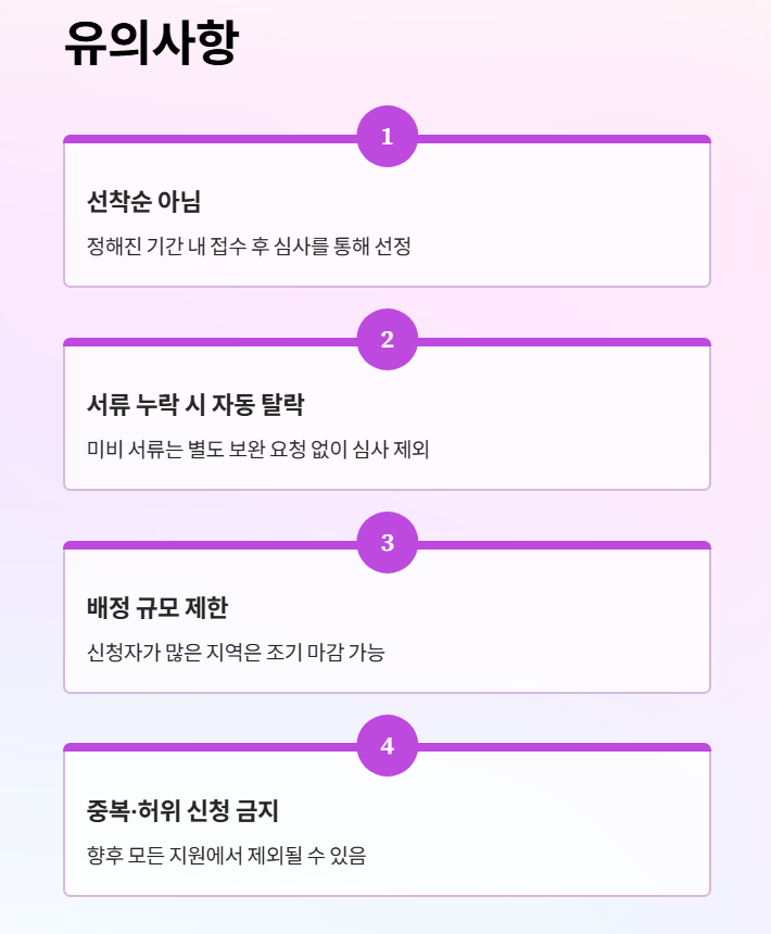 - 배정 규모 제한이 있어 신청자가 많은 지역은 자동 조기 마감될 수도 있어요.