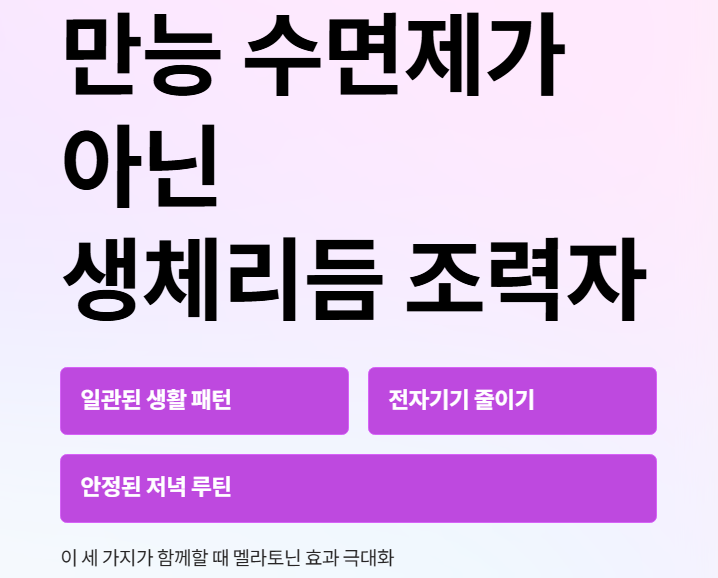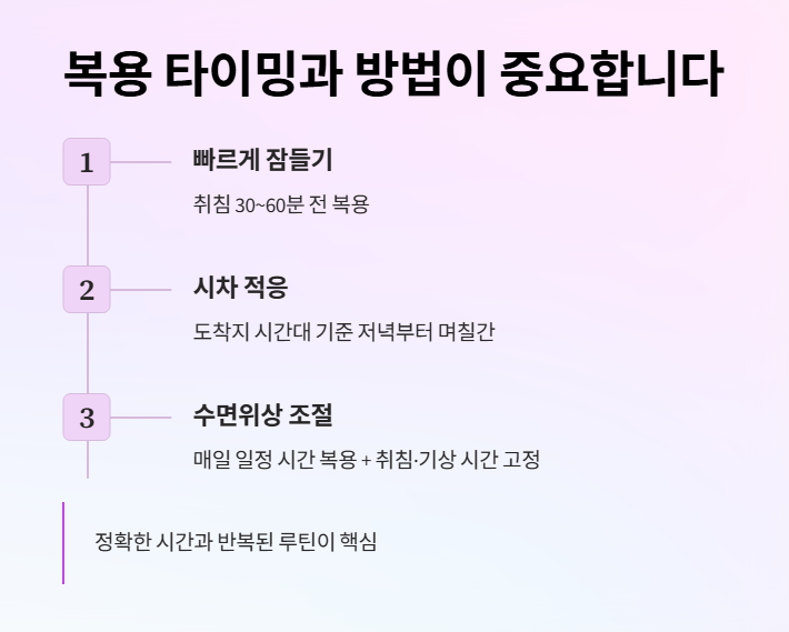 | 수면위상 조절(밤형 교정) | 매일 일정한 시간에 복용하고, 취침-기상 시간도 고정하여 리듬 유지 |