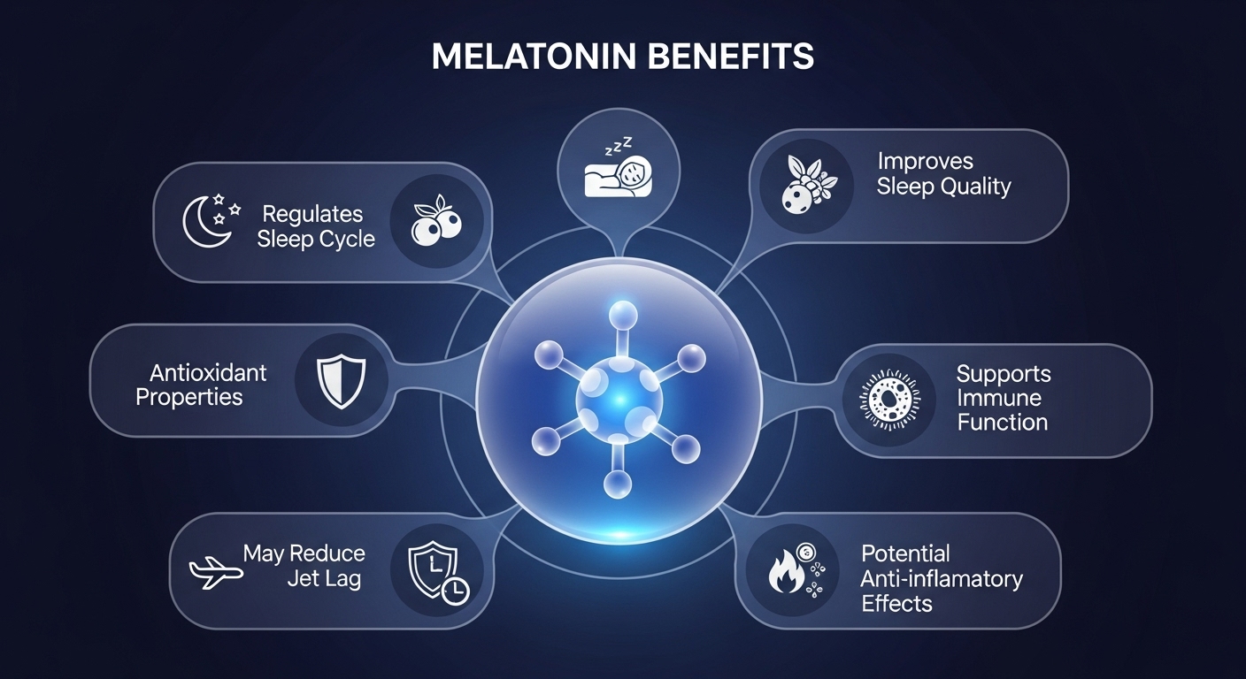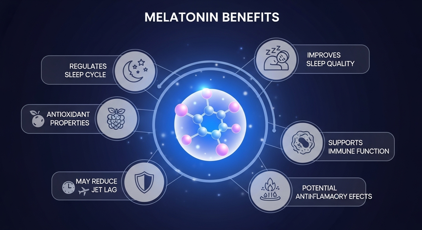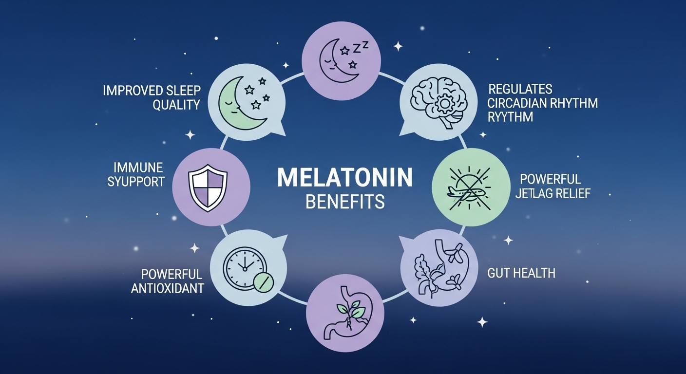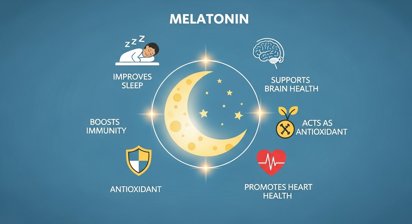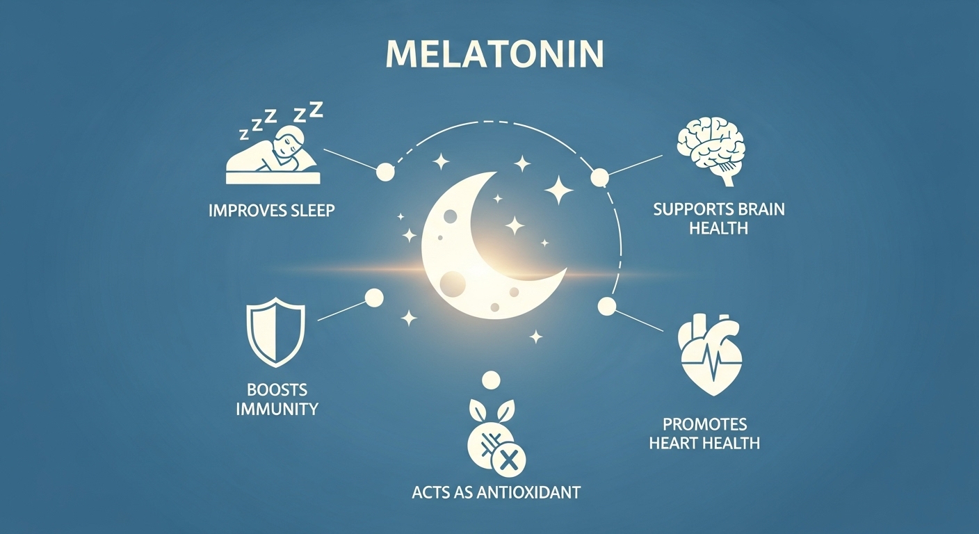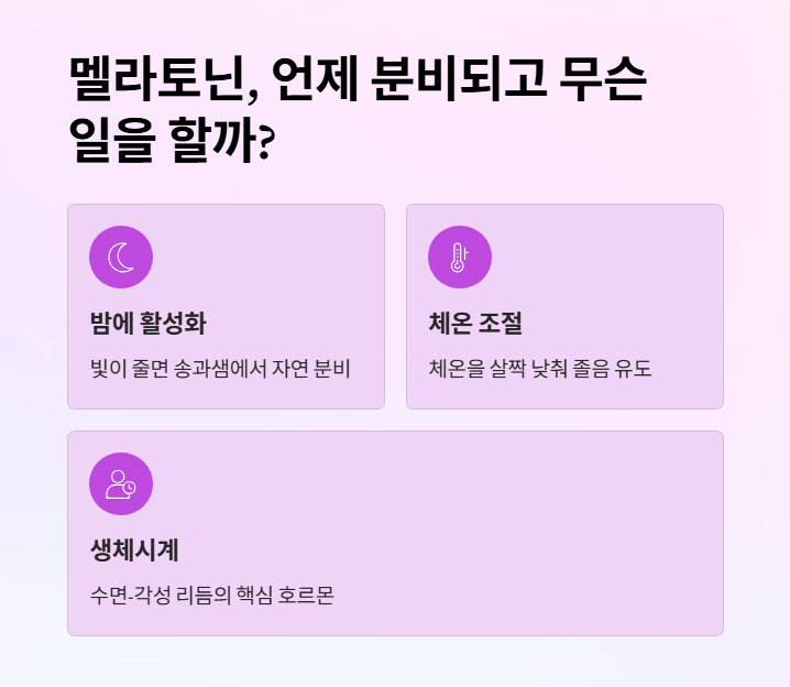 멜라토닌은 밤이 되면 뇌 속 송과샘에서 자연스럽게 분비됩니다. 빛이 줄어들면 활성화되고, 체온을 살짝 낮추며 졸음을 유도해 "이제 잠들 시간이야"라는 신호를 보내요. 그래서 수면-각성 리듬 조절에 핵심 역할을 합니다.