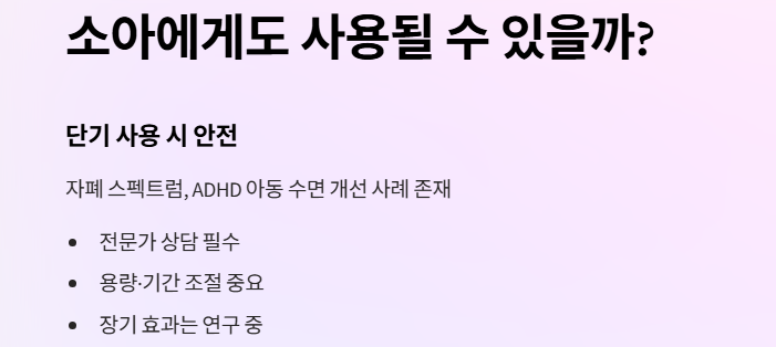 단기적으로는 대체로 안전하다는 평가가 있으며, 자폐 스펙트럼이나 ADHD 아동의 수면 패턴 개선에 사용된 사례도 있습니다. 하지만 반드시 전문가와 상의 후 사용하는 것이 원칙이에요.