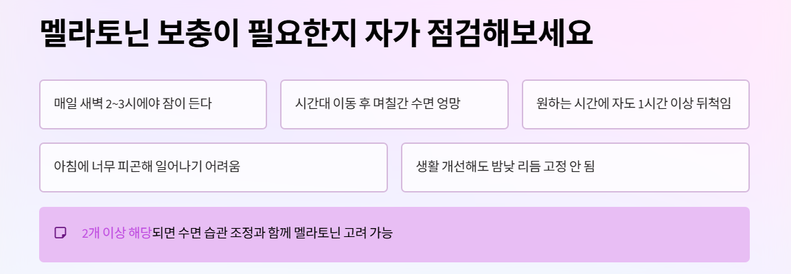 해당 항목이 2개 이상이라면, 수면 습관 조정과 함께 멜라토닌 활용을 고려해볼 수 있어요.