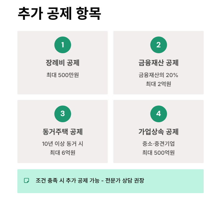 - 동거주택 상속공제: 10년 이상 동거한 경우, 최대 6억원
