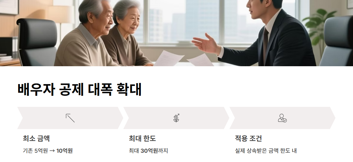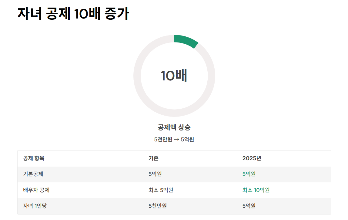 2025년 개정으로 배우자 공제 최소 금액이 기존 5억원에서 10억원으로 상향됐습니다.