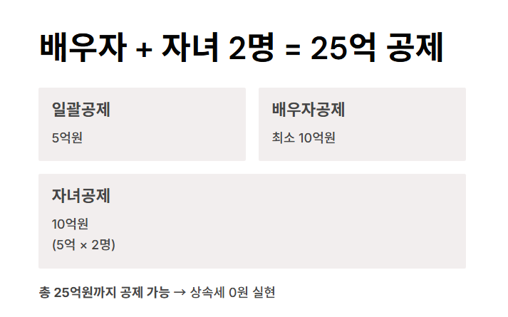 일괄공제 5억 + 배우자공제 최소 10억 + 자녀공제 10억(5억 × 2명)