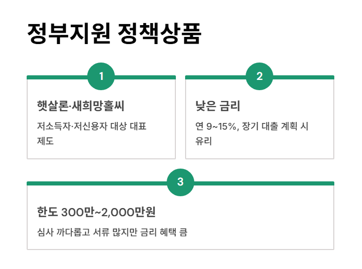 | 햇살론/새희망홀씨 | 최대 2,000만원 | 9~15.9% | 저신용자 대상, 서류 많고 심사 복잡 |