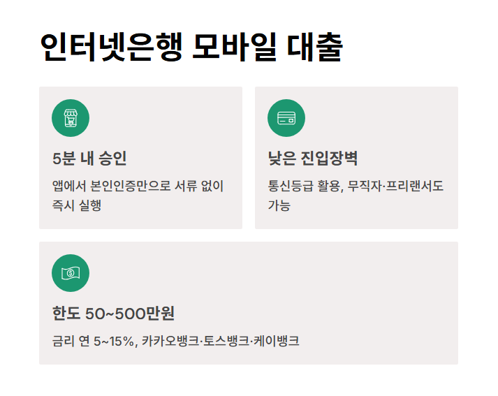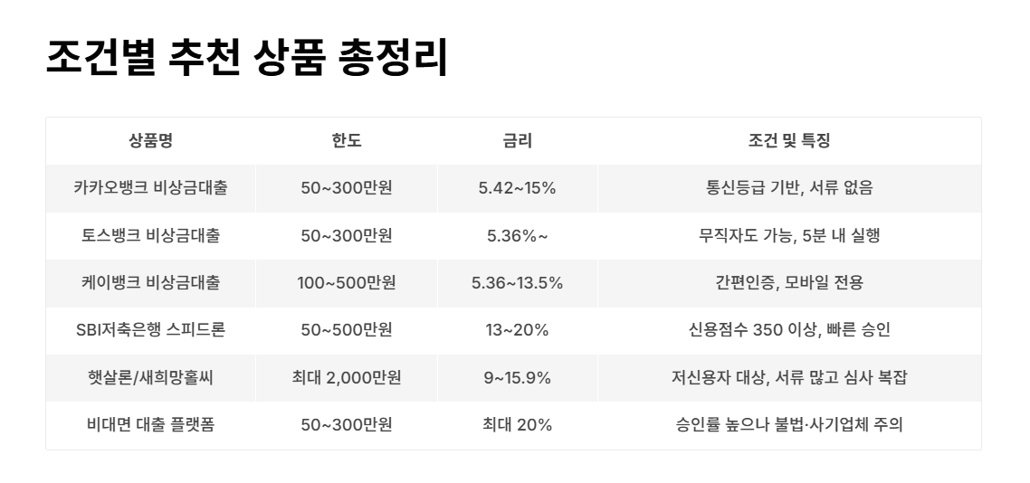 | 카카오뱅크 비상금대출 | 50~300만원 | 5.42~15% | 통신등급 기반, 서류 없음 |