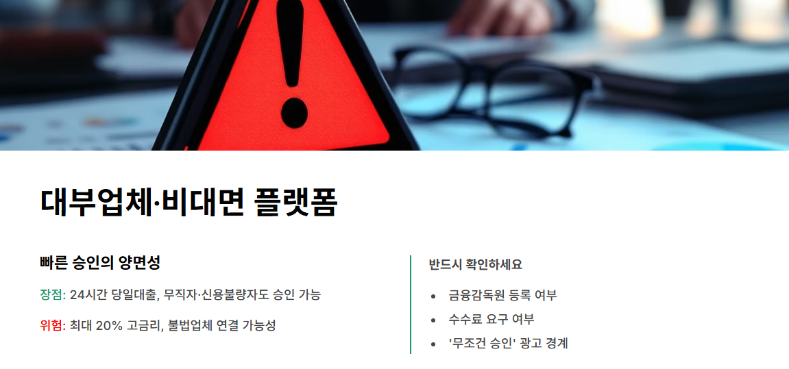 | 비대면 대출 플랫폼 | 본인 인증만, 무직자도 가능 | 최대 20% | 당일 대출 가능, 사기 주의 |