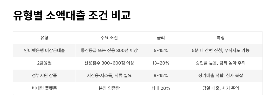 | 인터넷은행 비상금대출 | 통신등급 또는 신용 300점 이상 | 5~15% | 5분 내 간편 신청, 무직자도 가능 |