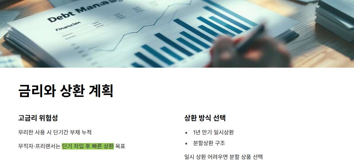 단, 금리는 연 13~20% 수준으로 다소 높은 편이며, 연체 시 불이익도 크기 때문에 철저한 상환 계획이 필요합니다.