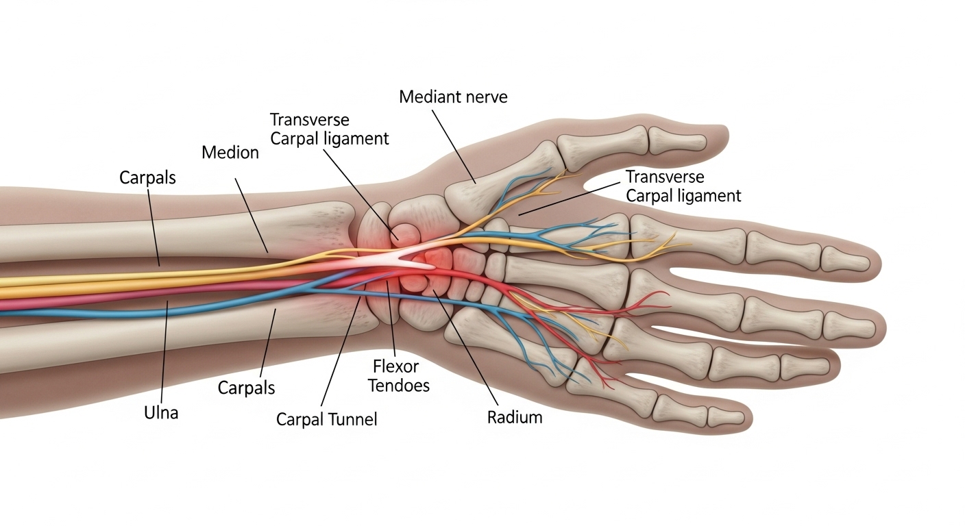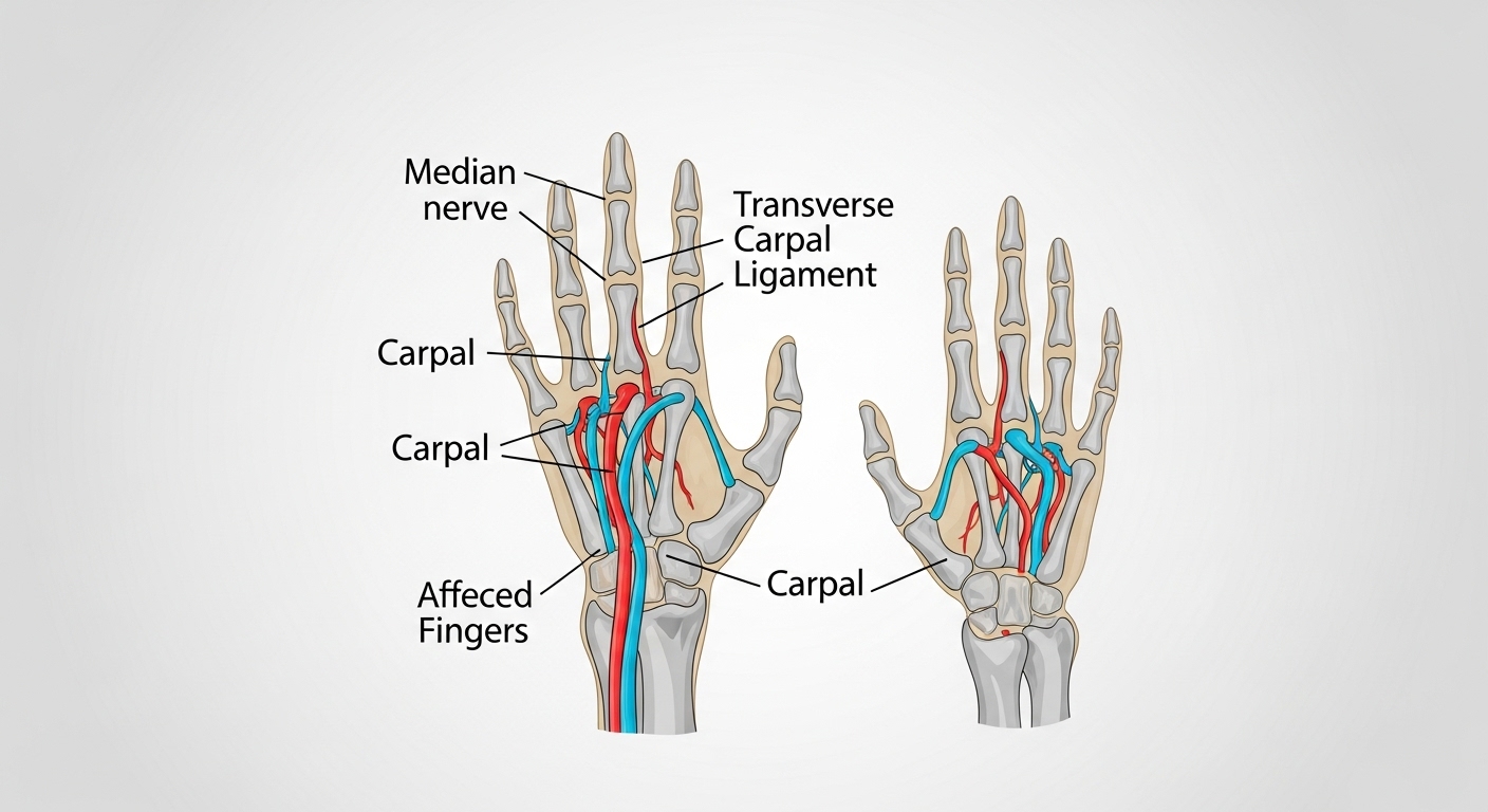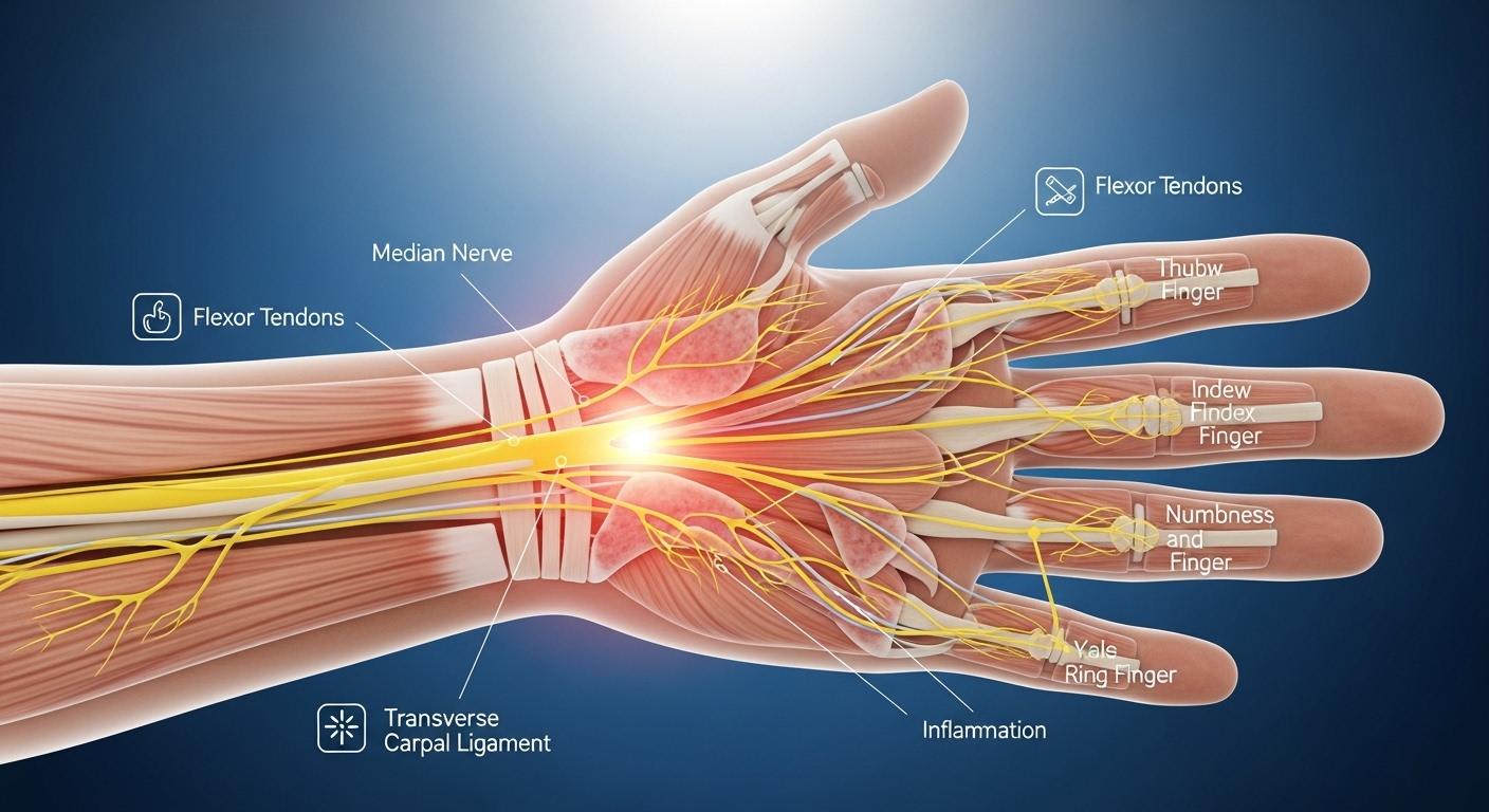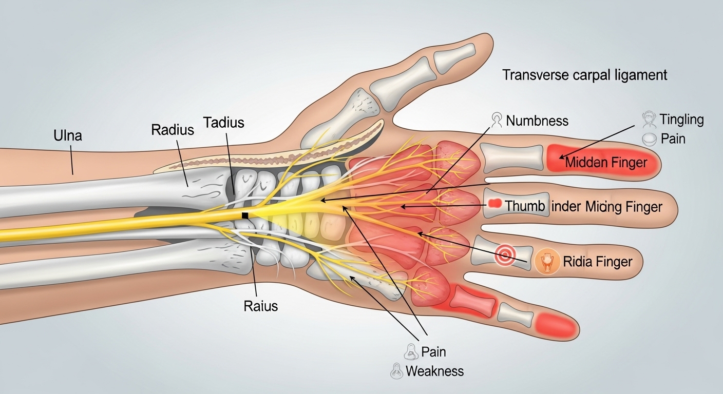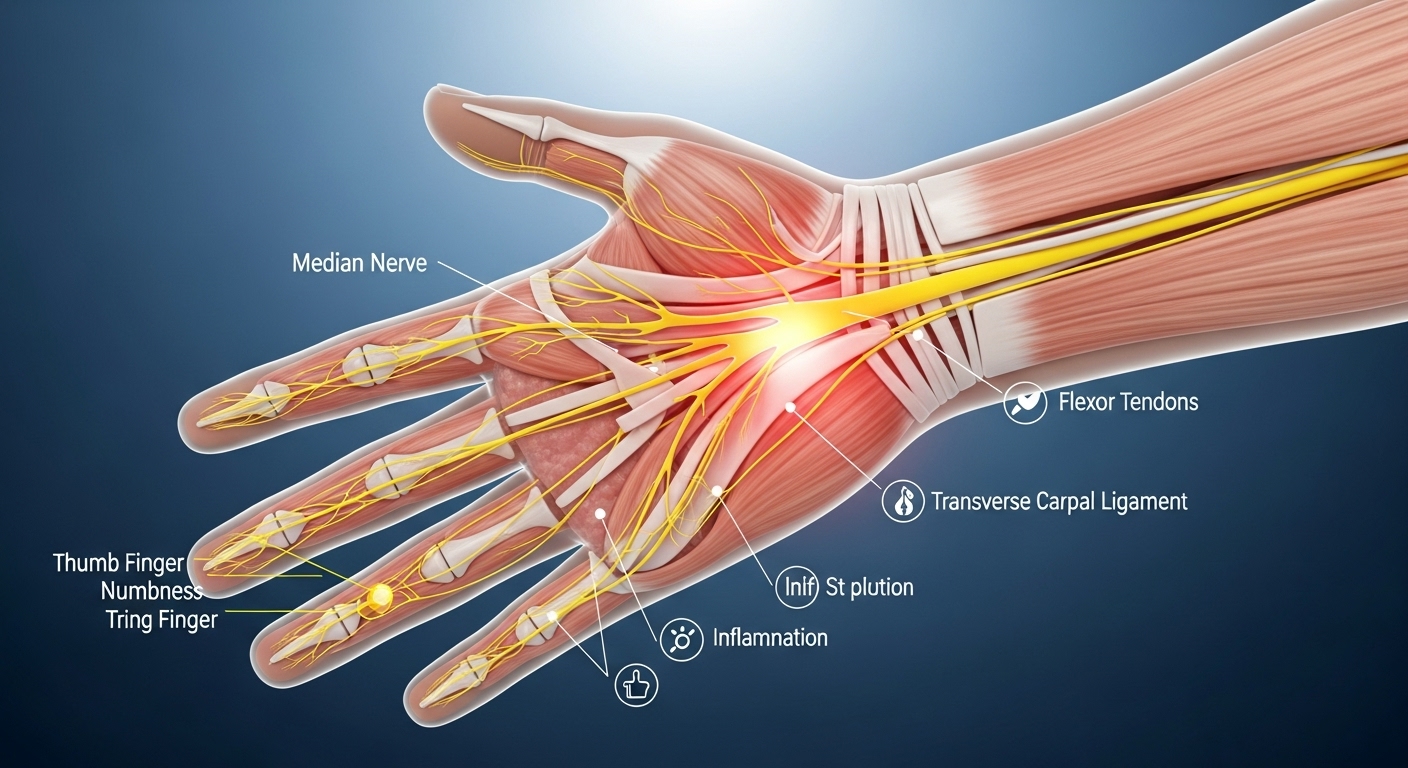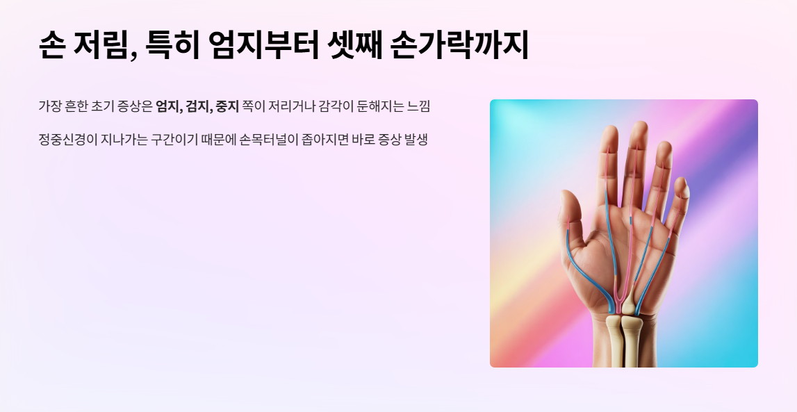 가장 흔한 초기 증상은 엄지, 검지, 중지 쪽이 저리거나 감각이 둔해지는 느낌이에요. 이 부위는 정중신경이 지나가는 구간이기 때문에 손목터널이 좁아지면 바로 이런 증상으로 이어지게 됩니다.