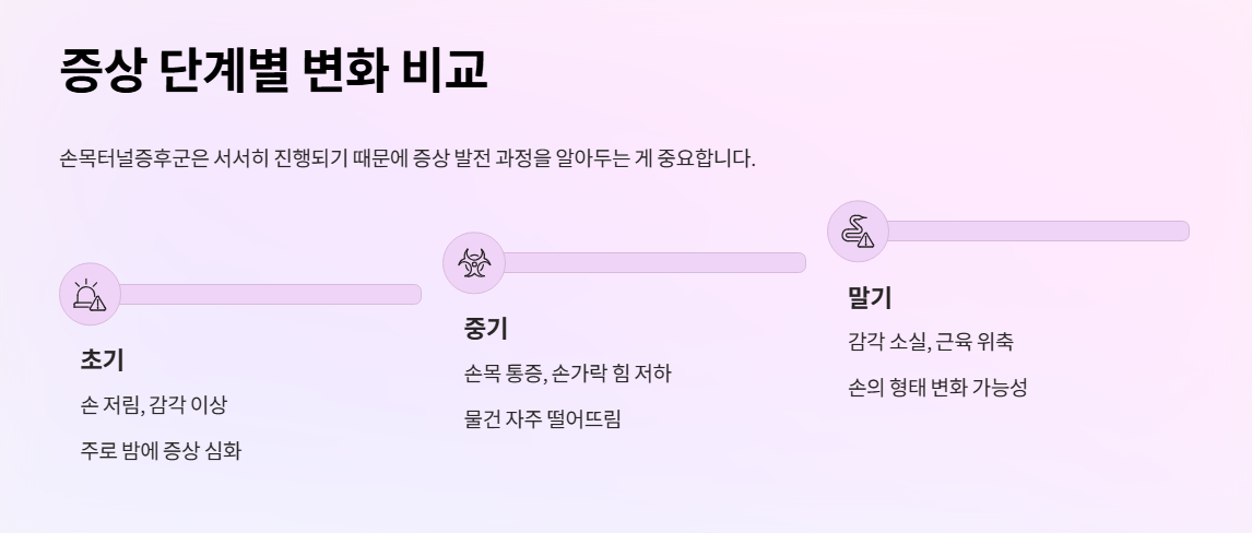 | 초기 | 손 저림, 감각 이상 | 주로 밤에 증상 심화 |