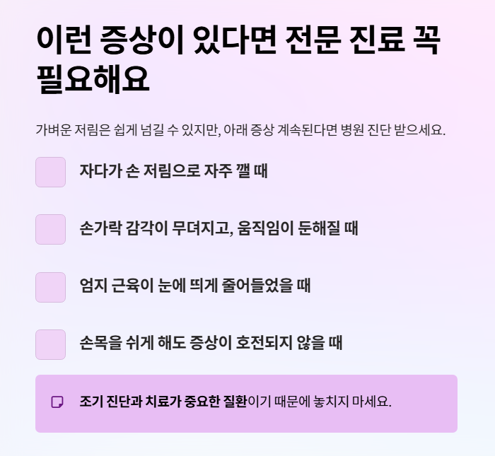 | 중기 | 손목 통증, 손가락 힘 저하 | 물건 자주 떨어뜨림 |