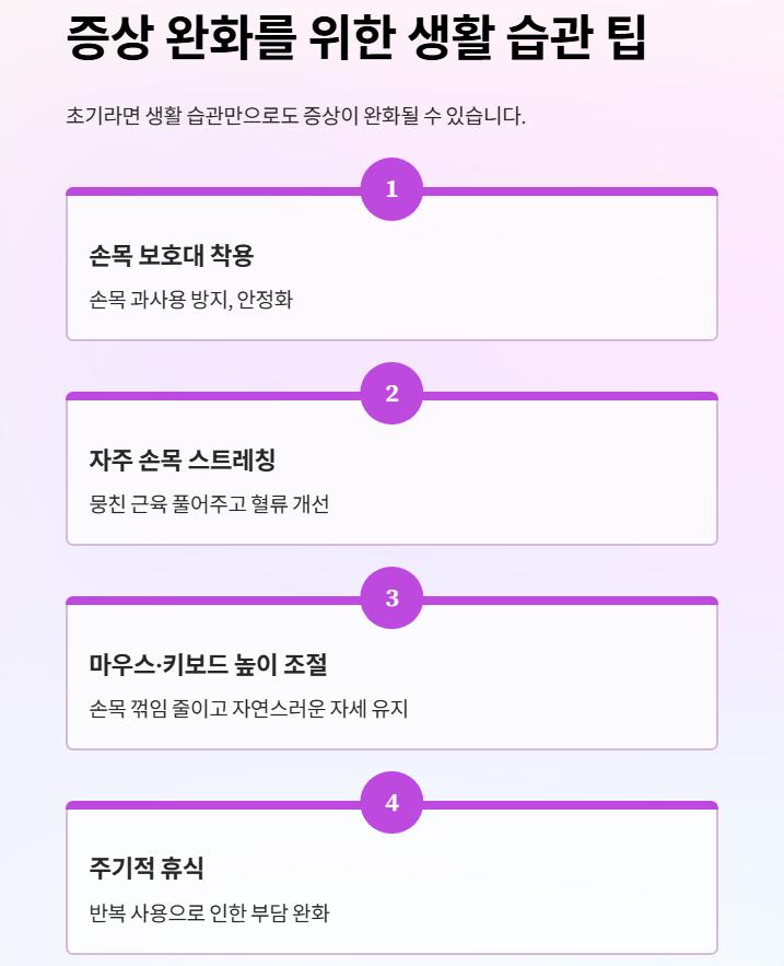 초기라면 생활 습관만으로도 증상이 완화될 수 있습니다. 아래 내용을 참고해 평소 손목 사용 습관을 조절해보세요.