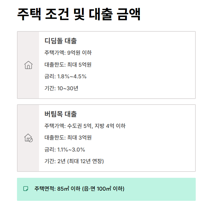 | 항목 | 디딤돌 대출(매매) | 버팀목 대출(전세) |