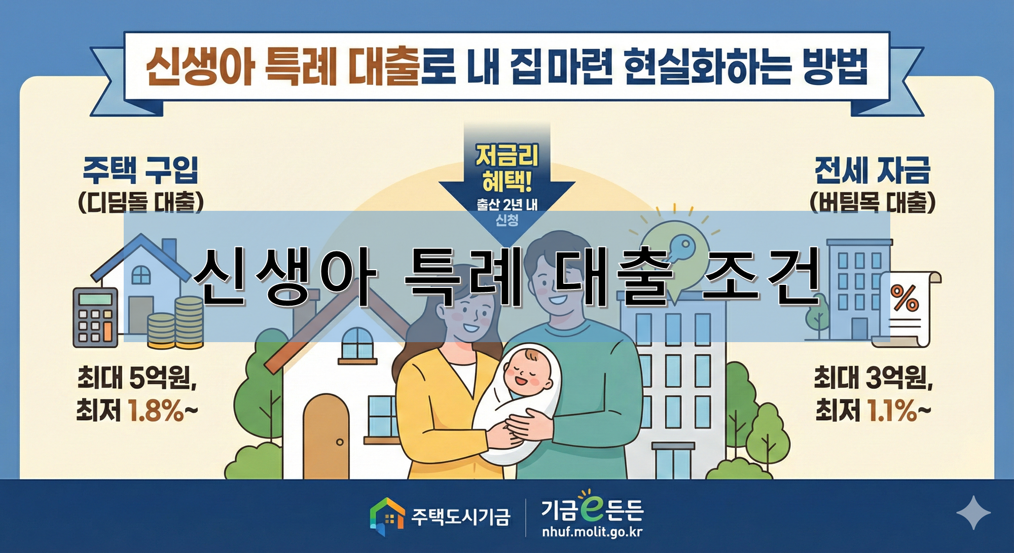 출산 이후 주거 부담을 줄이고 싶은 가정이라면 신생아 특례 대출을 주목해 보세요. 이 제도는 무주택 세대주로서 출산 또는 입양을 한 경우, 주택 구입(디딤돌 대출)이나 전세(버팀목 대출)에 있어 낮은 금리와 넉넉한 한도로 지원을 받을 수 있는 정책 금융상품입니다. 단, 출산 또는 입양일로부터 2년 이내 신청해야 하며, 소득·자산 요건도 충족해야 합니다. 어떤 조건이 필요한지, 어떻게 신청하면 되는지 지금부터 꼼꼼히 안내드릴게요.