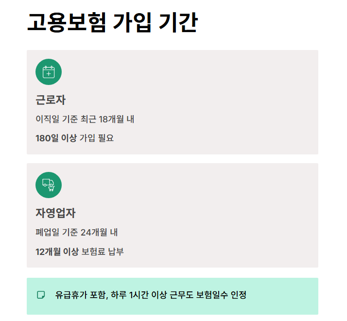 이직일 기준으로 최근 18개월 동안 고용보험에 가입된 일수가 180일 이상이어야 합니다. 유급휴가도 포함되며, 하루에 1시간 이상만 근무해도 보험일수로 계산되는 경우가 있습니다.