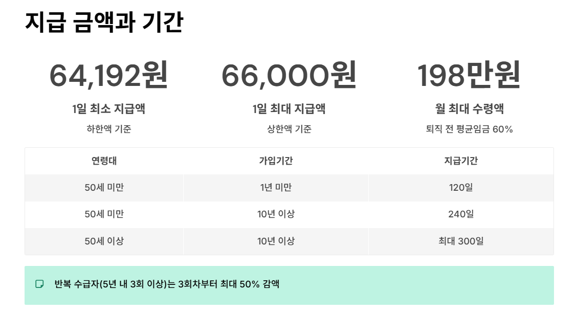 퇴직 전 3개월 평균 임금의 약 60% 수준이 지급 기준이며, 월 최대 약 198만원까지 받을 수 있어요.