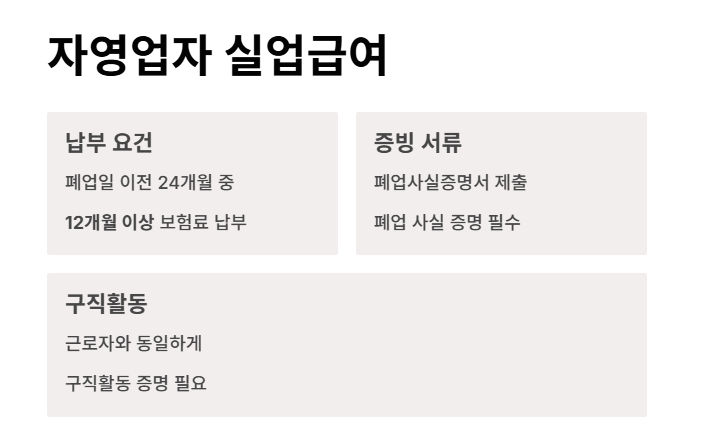 자영업자의 경우 폐업일 이전 24개월 중 12개월 이상 고용보험을 납부한 경우에만 수급 자격이 주어집니다.