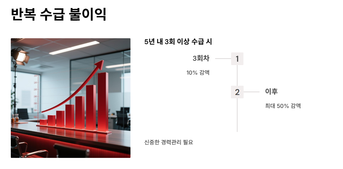 반복 수급자(5년 내 3회 이상)는 3회차부터 감액이 적용되며, 최대 50%까지 줄어들 수 있습니다.