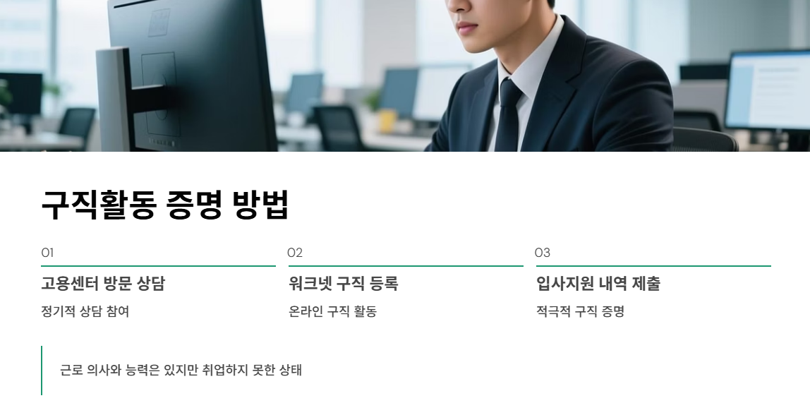 고용센터 방문 상담, 워크넷 구직 등록, 입사지원 내역 제출 등을 통해 실업 상태를 인정받아야 합니다. 미인정 시 지급이 중단될 수 있습니다.