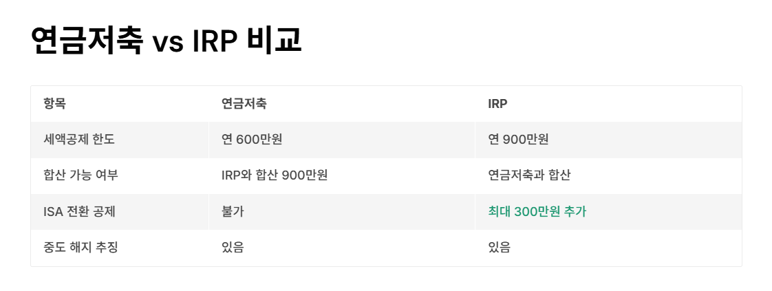 | 합산 가능 여부 | IRP와 합산 900만원까지 | 연금저축과 합산 |