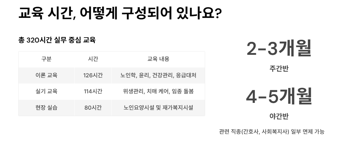 | 현장 실습 | 80시간 | 노인요양시설 및 재가복지시설 실무 |