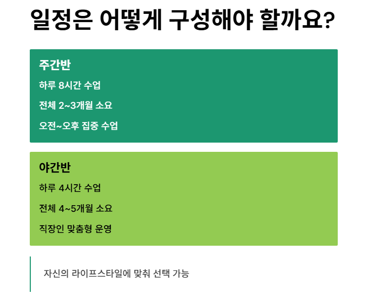 주간반은 오전~오후 수업 중심, 야간반은 직장인 맞춤형으로 운영됩니다.