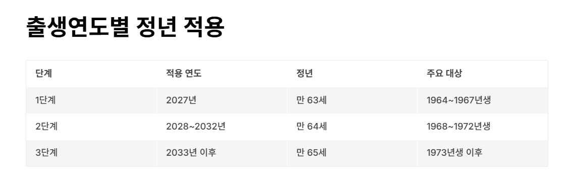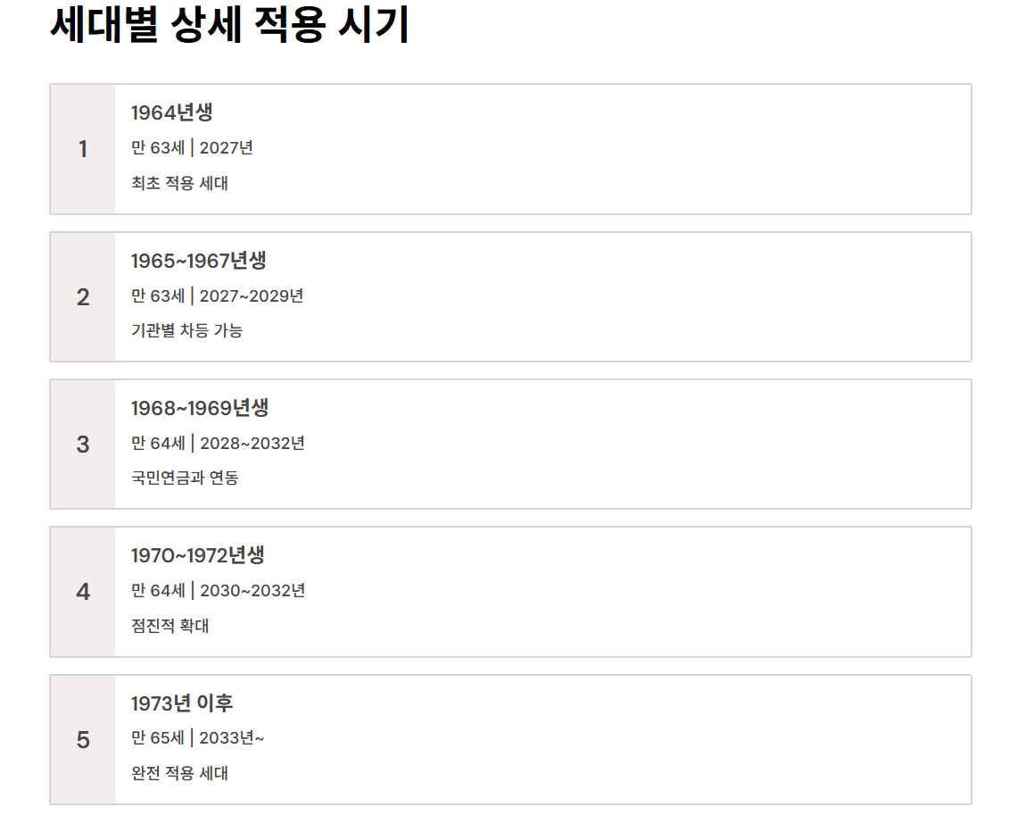 | 1단계 | 2027년 | 만 63세 | 1964~1967년생, 공공기관·대기업 |