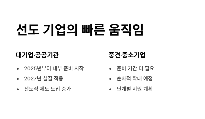 반면, 중견·중소기업은 준비 기간이 더 필요하기 때문에 순차적으로 확대될 예정입니다.